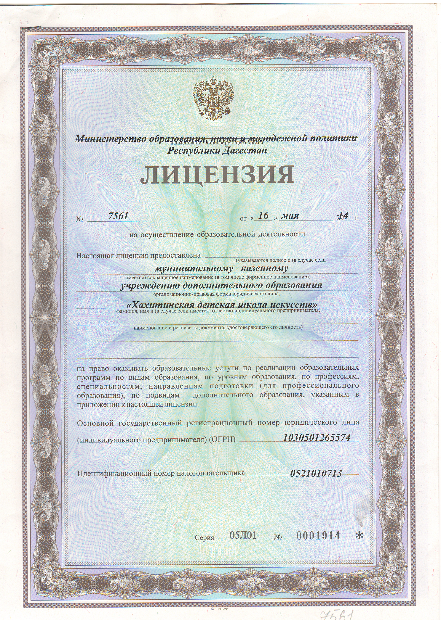| Полное наименование образовательной организации* | Муниципальное казенное учреждение дополнительного образования "Хахитинская детская школа искусств" |