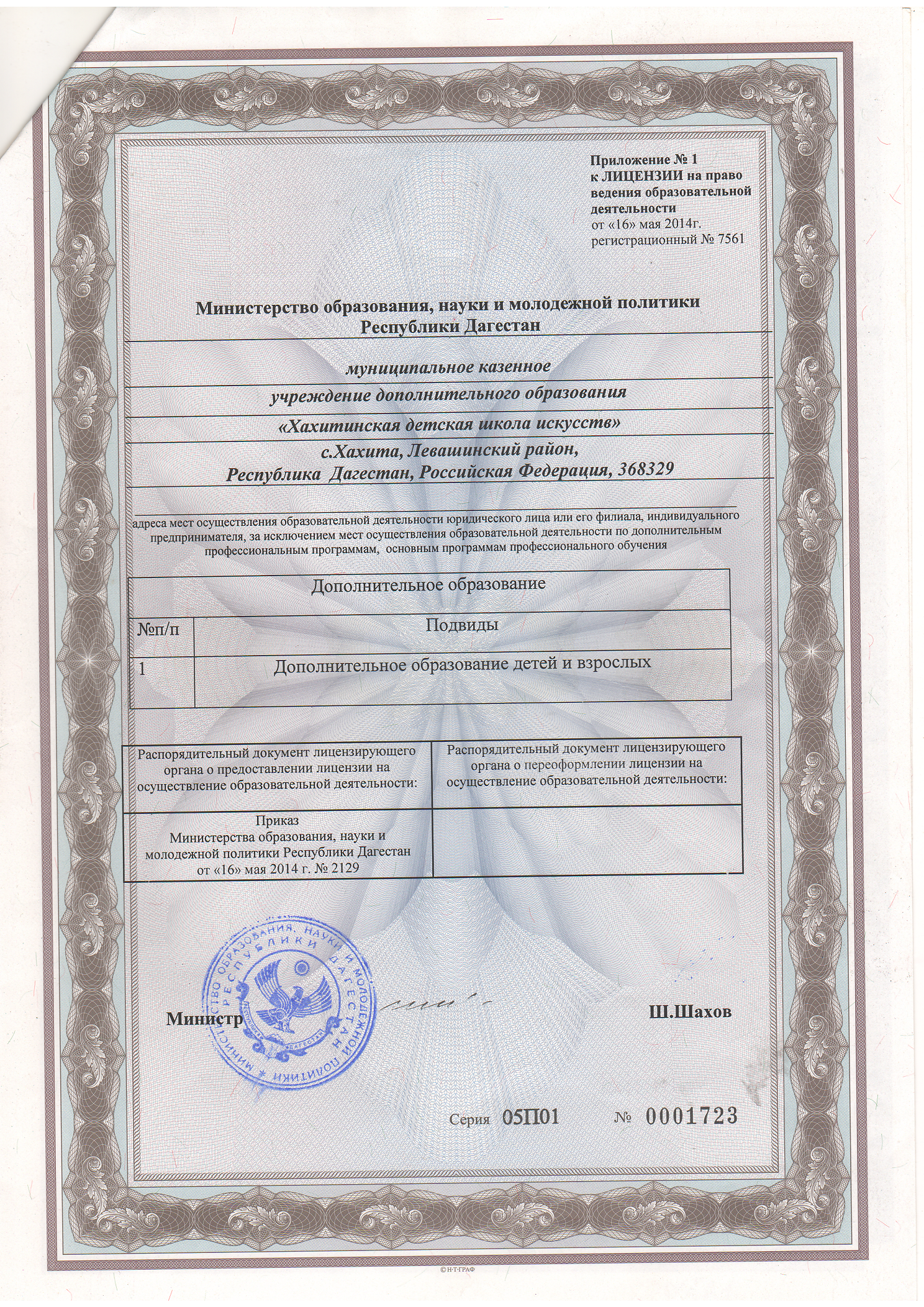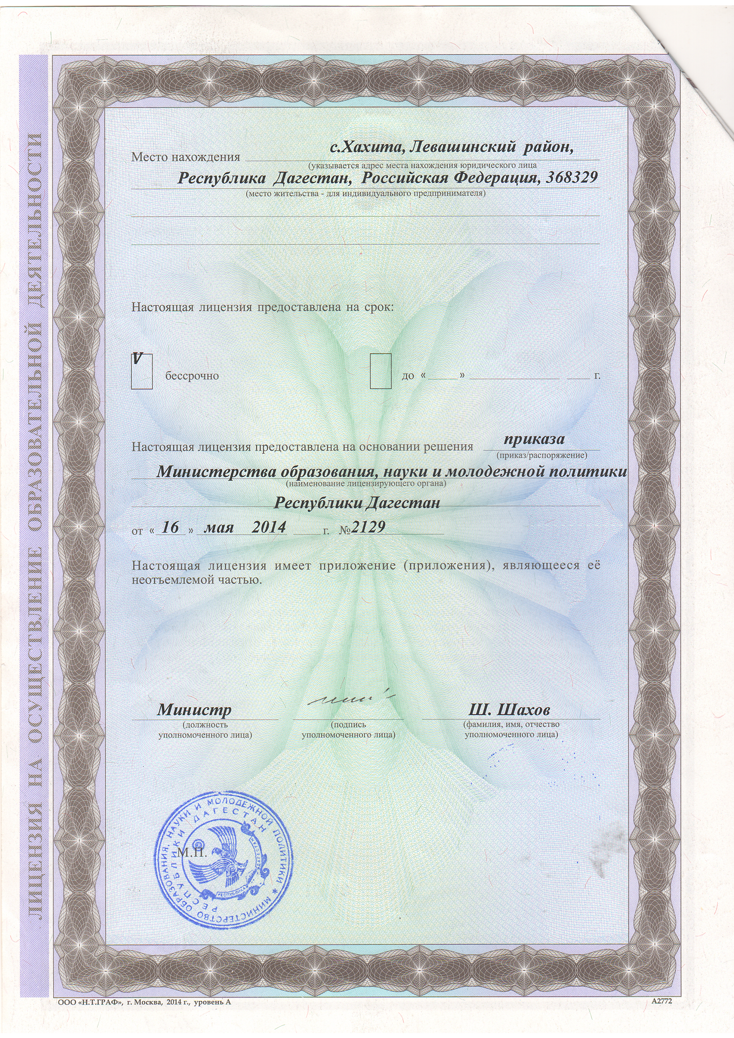 | Адрес местонахождения образовательной организации* | 368329, Республика Дагестан, Левашинский район, с. Хахита |